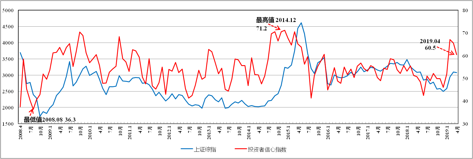 圖六 投資者信心指數與上證綜指走勢對比圖(2008.4-2019.4)